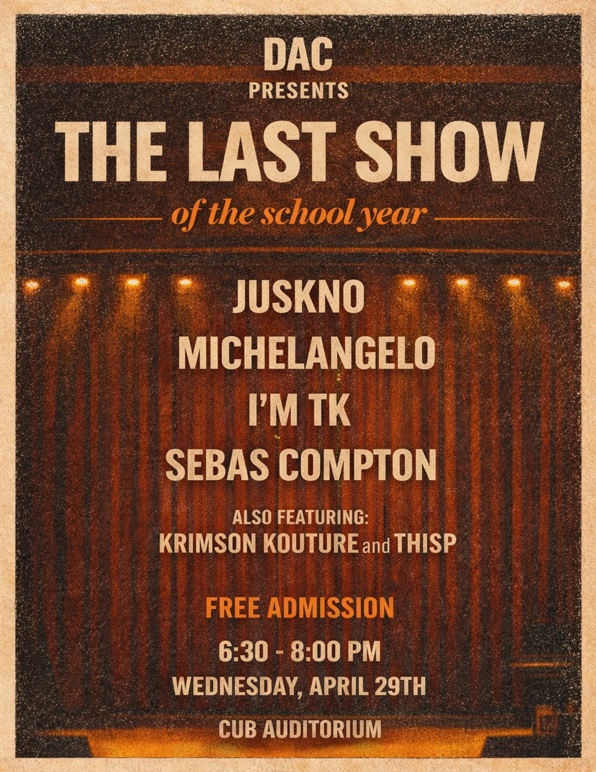 DAC Presents The Last Show of the School Year featuring RnB and hip hop from juskno, Michelangelo, I’m TK, Sebas Compton. Also featuring: Krimson Kouture & Thisp (DJ). The event is free and open to the public. The event is all-ages but please be advised there may be explicit language.